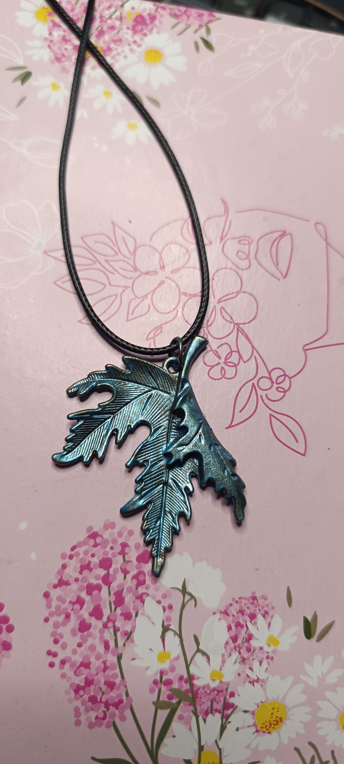 Grâce à sa teinte bleutée envoûtante, ce bijou invite au calme et à la clarté d’esprit, tout en évoquant la magie discrète des clairières au crépuscule. Associé à un cordon noir sobre, il met en valeur la beauté naturelle de la feuille, véritable messagère des bois sacrés.
