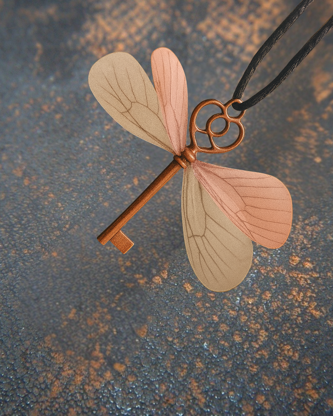 Un talisman délicat, en forme de clé ancienne, orné d’ailes douces aux teintes rosées.