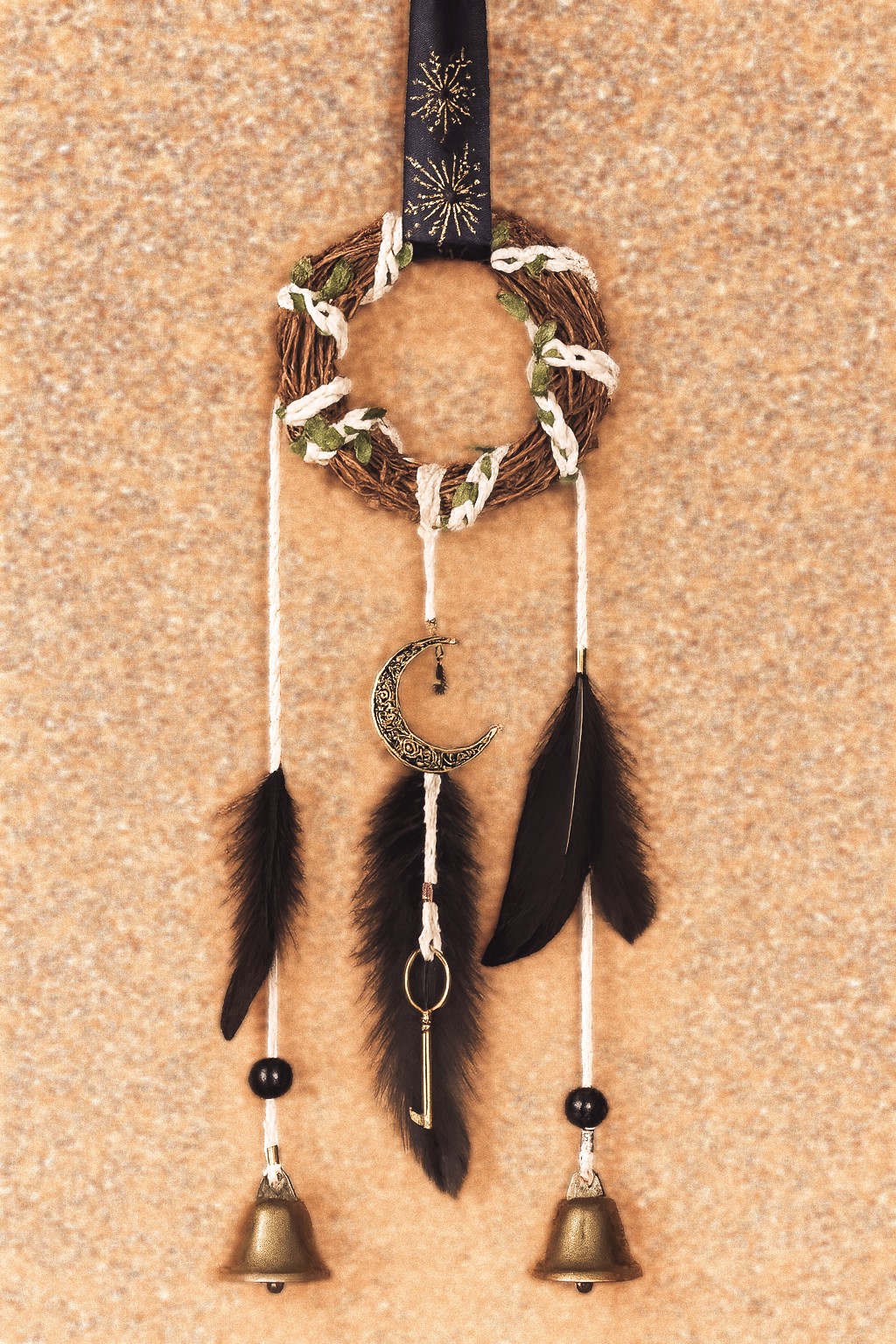 Ce modèle artisanal associe des matériaux naturels à des éléments spirituels. Avec sa couronne en branches tressées, ornée de feuillage et de rubans clairs, représente le cycle de la vie et la connexion à la Terre. Aussi, au centre, une lune ciselée en métal incarne la magie, l’intuition et la transformation. Les plumes noires symbolisent la protection et l’équilibre entre ombre et lumière. Ainsi, chaque détail est porteur d’une intention bienveillante.