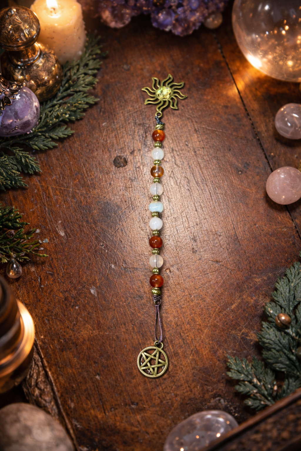 Cette échelle de sorcière est un talisman symbolique conçu pour porter intentions, souhaits et protections. Composée de perles naturelles et de symboles lunaires, elle accompagne les rituels personnels tout en apportant une présence spirituelle douce et décorative à votre espace sacré.