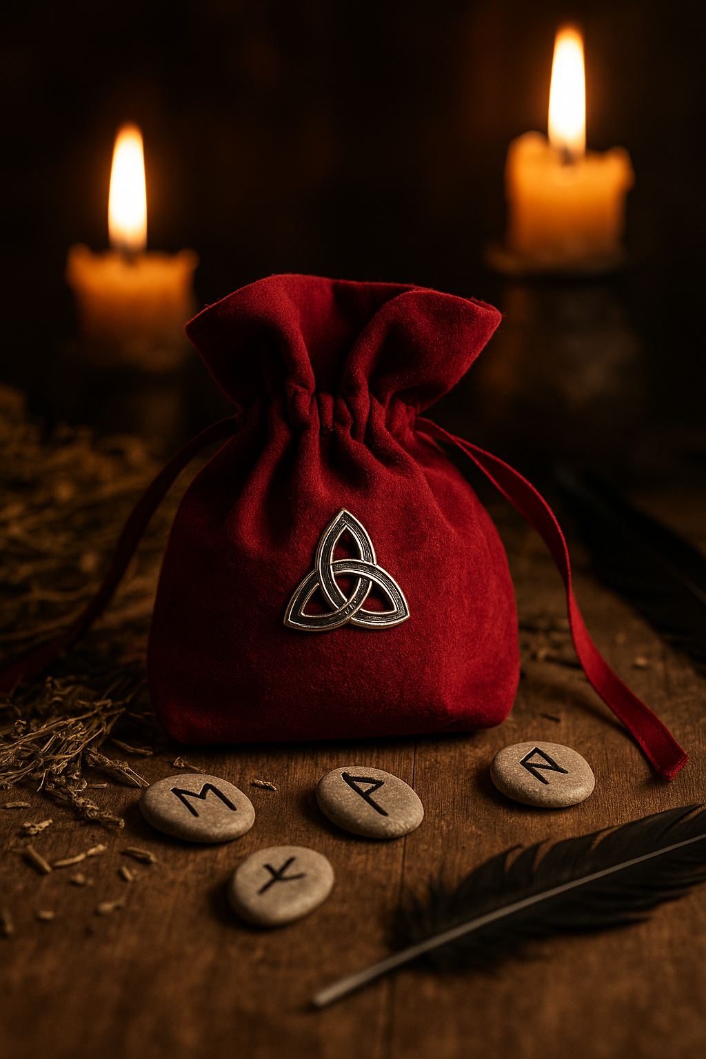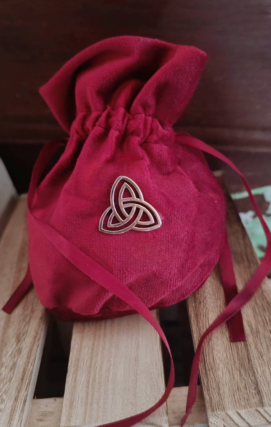 Née de l’alliance du rouge bordeaux profond – couleur du sang, du courage et de la vitalité – et de la triquetra, ancien nœud des cycles et de l’éternité, elle devient un talisman d’unité et de puissance. C’est une bourse qui embrase, qui protège et qui relie à la lignée invisible.