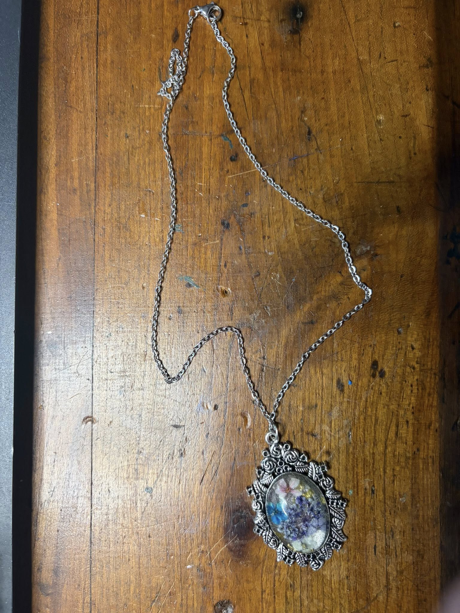 Par ailleurs, les reflets subtils de la résine captent la lumière avec douceur, révélant progressivement les textures et les couleurs des fleurs emprisonnées dans la matière. Ainsi, selon l’éclairage, le pendentif semble changer d’atmosphère, passant d’une teinte douce et brumeuse à un éclat plus lumineux, presque féerique.