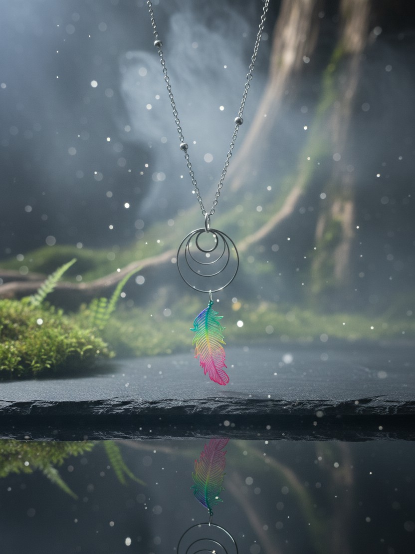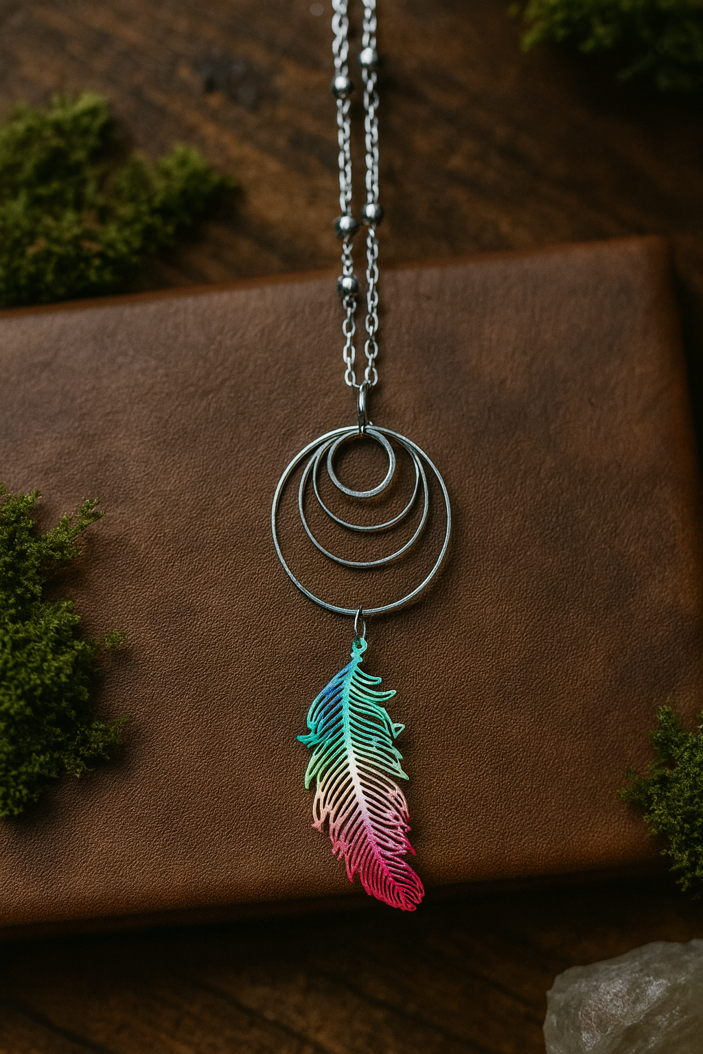 Ici, les anneaux argentés évoquent les cycles de la vie et l’énergie des cercles sacrés. La plume colorée apporte une touche vibrante et lumineuse. Suspendue à une chaîne fine ornée de petites perles, elle semble flotter dans l’air, légère comme un souffle, rappelant la beauté des instants suspendus.