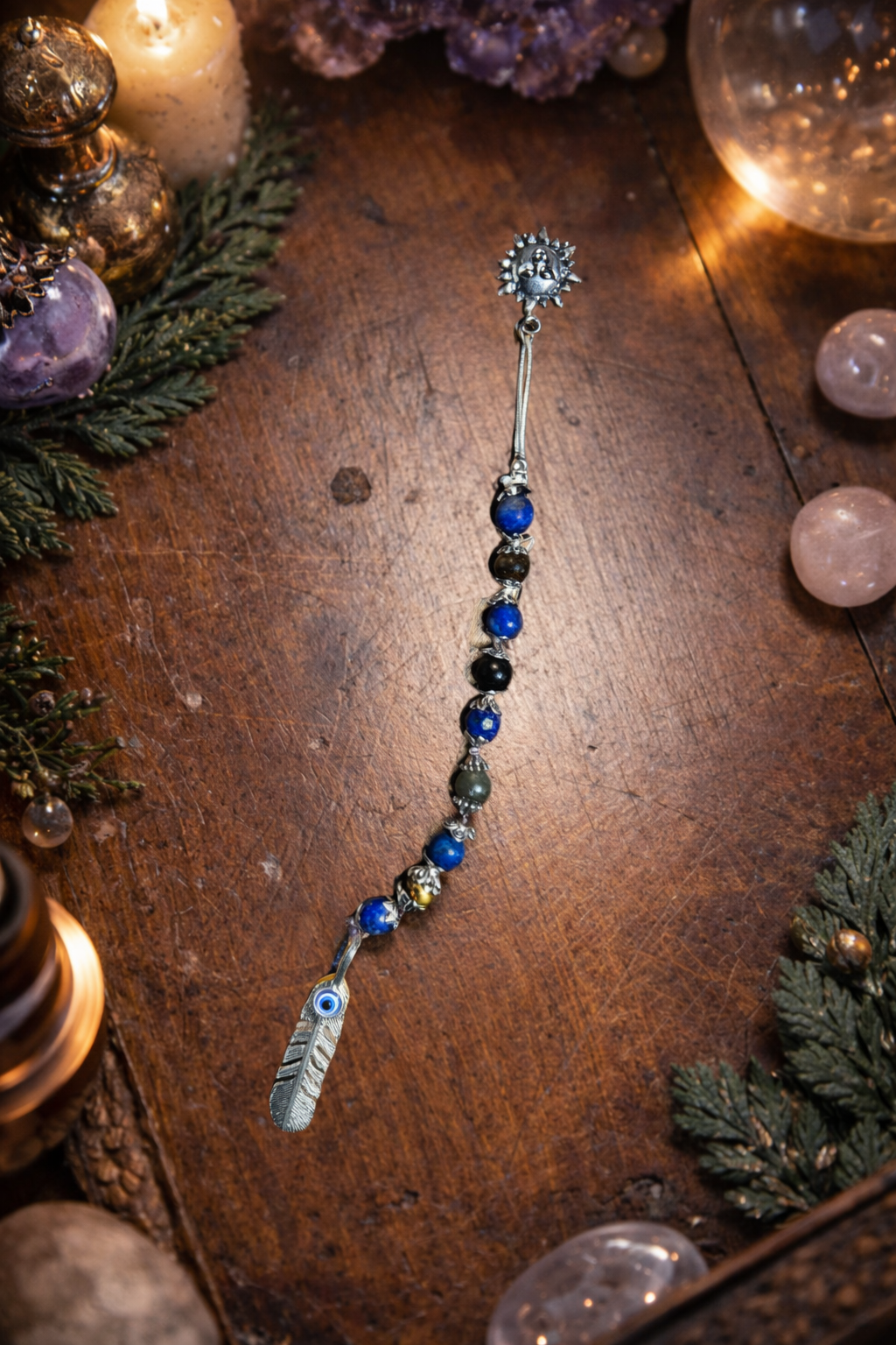 Ornée d’un symbole solaire en partie supérieure et d’un pendentif protecteur en partie inférieure, cette échelle de sorcière symbolise l’équilibre entre lumière et ombre. De plus, sa composition minérale renforce son intention protectrice et spirituelle.