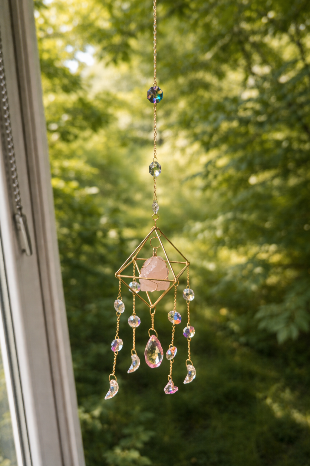 Suspendu près d’une fenêtre, ce suncatcher en quartz rose transforme chaque rayon de soleil en éclats lumineux qui viennent doucement illuminer la pièce. Au fil de la journée, de petites touches d’arc-en-ciel apparaissent sur les murs, créant une atmosphère douce et chaleureuse.