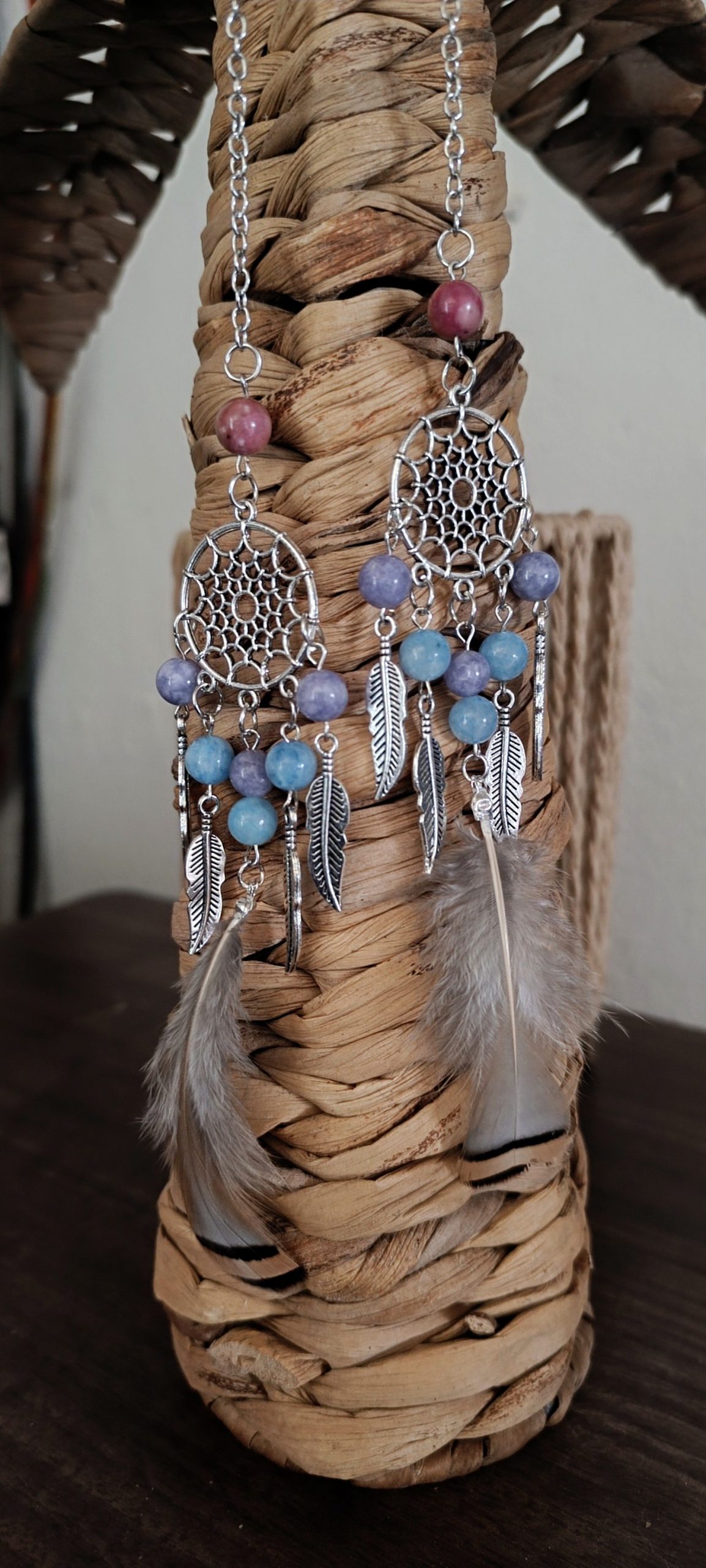 Un talisman d’harmonie Rhodochrosite pour l’amour, Lépidolite pour la paix intérieure, Angélite pour la connexion spirituelle… Reliés à la légèreté des plumes de tourterelle, messagères de douceur et de fidélité.Un souffle de sérénité à porter près de soi 🌿 Pourquoi commander chez Cernunia ? ✔ Fait main avec soin dans mon atelier en France✔ Expédié sous…