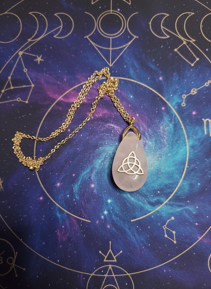 Le quartz rose évoque la paix, le calme et la tendresse. Pierre de guérison par excellence, elle est réputée pour apaiser les émotions, favoriser la confiance en soi et ouvrir le cœur à l’amour sincère. Grâce à son énergie douce et lumineuse, elle accompagne les moments de transformation intérieure et aide à accueillir les émotions avec bienveillance. Associée à la Triquetra, elle devient un talisman de connexion et d’harmonie, rappelant la force des anciens symboles celtiques.