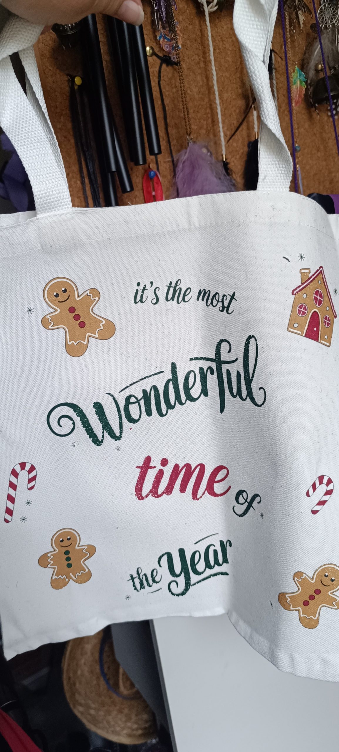 Le totebag “It’s the most wonderful time of the year…” 🎶 Rien que le lire, tu entends déjà les clochettes et tu sens l’odeur des biscuits au gingembre. Ce totebag en coton bio est une ode à la magie de Yule et de Noël. Orné de petits bonshommes pain d’épices, de cannes à sucre et d’une maison gourmande, il te plonge dans une ambiance festive, chaleureuse et gourmande.